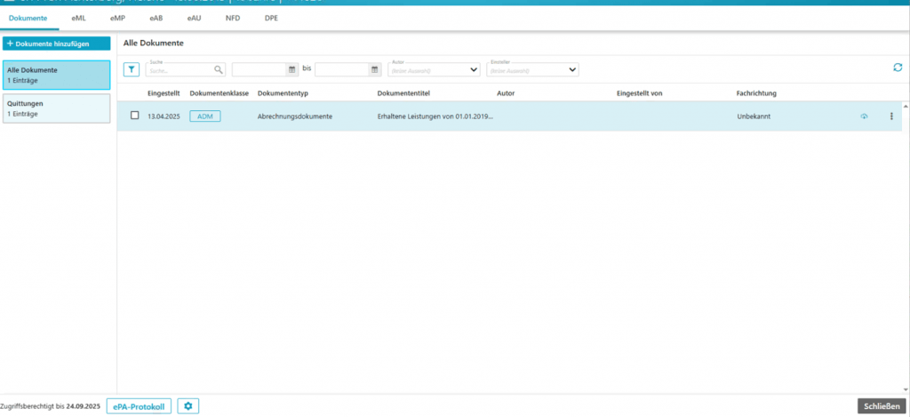 Hier kann man Dokumente ansehen, die Medikamente des eRezepts einsehen und andere Informationen erhalten: eML (Übersicht der eRezepte), eMP (elektronischer Medikationplan), eAB (eArztbrief), eAU, NFD (Notfalldatenmangement), DPE (Organspende usw.)